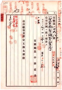 一二三 第一号 明治三四年七月律令第六号台湾公共埤圳規則ニ依ル公共埤圳認定理由ニ付テノ宜蘭庁長中田直温ノ告諭ノ件