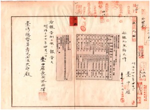 三四 第三四号 鳳山庁大竹里順後街ノ蔡興・王炭・蔡朝枝・郭来・陳取・謝扶生司・陳石虎・林石頭・江瑞全・蔡査某ハ船鑑札流失ニ付キ該鑑札ヲ無効トスル旨同庁ヨリ通知ノ件
