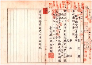 彰化廳訓令第一號三十五年訓令第三十二號廢止、彰化廳訓令第二號警察費所屬物品取扱規則(廢令第三號ニアリ)、彰化廳訓令第三號市場取締規則取扱手續(廢令第三號ニアリ)