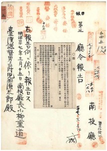 一五 第二七号 南投庁五城堡頭社庄ニ牛疫発生ニ付キ蔓延ノ兆アルニ依リ牛羊属ノ出入及ヒ病毒伝播ノ虞アル物品ノ運搬ヲ停止ス