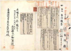 南投廳告示第百一號林其木阿片煙膏請賣營業禁止、南投廳告示第第百二號彰化廳下牛疫流行地解除通知、南投廳告示第第百三號頭社庄牛疫發生、南投廳告示第百四號林元仲阿片煙膏請賣營業特許