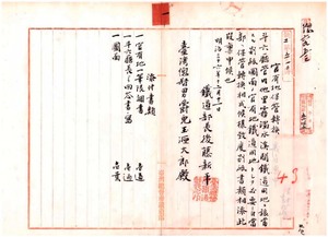鐵道部長稟申官有地保管轉換(斗六廳管下他里霧濁水溪所在地)ノ件、右鐵道部ニ引繼方斗六廳長通牒、右地所ノ內二筆ハ民有地ニヤキ刪除方斗六廳長上申