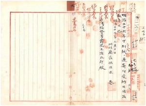 六 林万喜・劉阿老・陳和尚・陳得・林徳水・尤和鳴・許宗朝・王廷佐・江番・洪春莿ヨリ警察官吏派出所敷地其他土地建物トシテ公園予定地・阿猴庁舎敷地・橋梁修繕施工ヲ明治三六年中寄附受納許可ノ件阿猴庁長佐々木基ヨリ報告