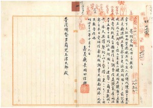 二 嘉義庁管内大坵田西堡港墩庄外七庄人民総代陳盛ノ出願東石港支庁墘警察官吏派出所用トシテ共有家屋二棟及敷地ノ寄附受納ノ件同庁長岡田信興ヨリ報告