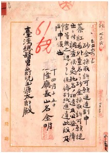 一 藤田伝三郎・栗山和吉・木村久太郎・蔡紅毛・松山金二ヘ基隆庁基隆堡及ヒ三貂堡内ノ金鉱採掘許可ノ件