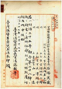 二一 総督府参事官長石塚英蔵ニ官国幣社神職尋常試験委員長ヲ命シ、総督府参事官ノ大内丑之助・持地六三郎、総督府秘書官大津麟平、官幣大社台湾神社宮司山口透ニ官国幣社神職尋常試験委員ヲ命ス