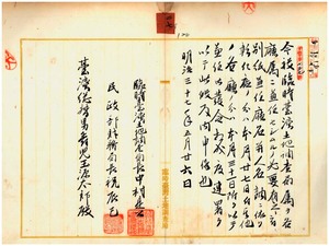 二七 臨時台湾土地調査局属ノ及川文治・杉山茂市・加部信一ヲ台北庁属ニ 、臨時台湾土地調査局属ノ鈴木文治・山下雄輔ヲ宜蘭庁属ニ 、臨時台湾土地調査局属星野須賀雄ヲ深坑庁属ニ 、臨時台湾土地調査局属ノ小倉聞浄・岡部直・杉本旦巳ヲ桃仔園庁属ニ 、臨時台湾土地調査局属児玉亀三郎ヲ新竹庁属ニ 、臨時台湾土地調査局属ノ中村通一・中野清三郎・海老原豊晴・近藤純治ヲ苗栗庁属ニ 、臨時台湾土地調査局属ノ茂里茂八・新田元重ヲ台中庁属ニ 、臨時台湾土地調査局属ノ佐藤正二・和田正勇ヲ彰化庁属ニ 、臨時台湾土地調査局属小幡平治ヲ南