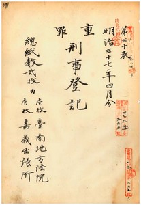 五 明治三七年四月分 重罪刑事登記台南地方法院 一枚同院嘉義出張所 一枚