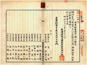 一六 明治三八年四月二八日ニ星平作・本多季三郎・土性善九郎・渡辺平八・加藤木藤一郎・川原亀人・香曽我部吉次・田添二雄・蓼沼鉄之助・武山光規・中条文四郎・太田嘉三太・大内三郎・安山圭三・山城正鳴・古田金之助・酒匂七之助・水口八郎・久本平三郎・鈴木豊次郎・須山好三郎ニ師範部甲科卒業証書ヲ授与シタル旨台湾総督府国語学校長田中敬一ヨリ報告並ニ公学校教諭免許状授与ノ件