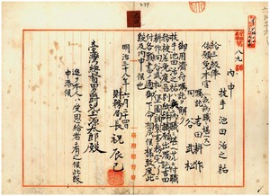 六二 総督府技手池田活之祐ノ辞職願ニ依リ本官ヲ免ス(1905/06/09~1905/06/26);堡図調製事務嘱託ノ吉田耕作・谷武松ヲ御用済ニ付キ嘱(1905/06/24~1905/06/26)