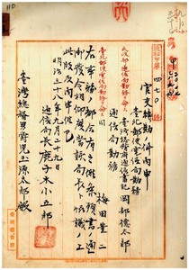 臺北郵便電信局書記岡部德太郎轉勤ノ件、通信書記梅田豐二臺北郵便電信局ヘ轉勤ノ件