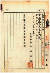 三二 第一〇六号 嘉義庁大目根堡竹頭崎庄陳朝和ハ食塩請売鑑札紛失ニ付キ該鑑札ヲ無効トスル旨同庁ヨリ通知ノ件