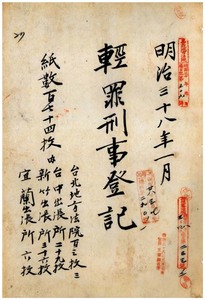 明治三十八年一月分輕罪刑事登記(台北地方法院、台中出張所、新竹出張所、宜蘭出張所)