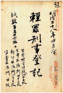 明治三十八年四月分輕罪刑事登記(台北地方法院、台中出張所、新竹出張所、宜蘭出張所)