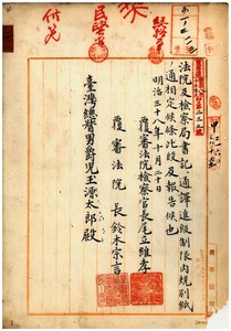 一 法院及ヒ検察局書記及ヒ通訳進級制限内規制定ノ儀報告