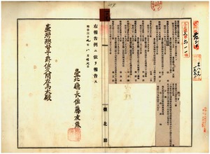 一〇九 第一四一号 台北庁大加蚋堡大稲花枋侏街ノ張田・曽細才、大加蚋堡大稲花建昌街佐藤一景、芝蘭一堡内湖庄何瑞淵、芝蘭一堡社仔庄陳清吉、芝蘭二堡嗄円別庄林烏獅、芝蘭二堡和尚洲南港仔庄楊法成、芝蘭三堡小八里戒仔庄施文于ハ船鑑札流失ニ付キ該鑑札ヲ無効トス