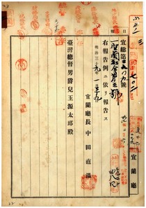三 第三号 団体費用徴収及寄附金品募集ニ関スル規則施行細則制定ノ件(1906-01-29~日付エラー);第四号 明治三八年七月宜蘭庁令第一〇号土地整理組合規則改正ノ件(1906-02-07~1906-03-20);第五号 明治三四年二月五日宜蘭庁令第六号貸座敷営業免許地域期限改正ノ件(1906-02-17~1906-03-26);第六号 明治三九年一月宜蘭庁令第三号団体費用徴収及寄附金品募集ニ関スル規則施行細則中改正ノ件(1906-02-27~1906-03-23);第七号 明治三四年一一月一一日宜蘭庁令第一七号支庁長取扱事項中改正ノ件(1906-02-27~1906-03-23);第八号 明治三三年二月一六日宜蘭庁令第五号警察取締ニ関スル諸営業開廃願届ノ件第二項ノ次ニ理髪業ノ項追加ノ件(1906-03-19~1906-04-24)