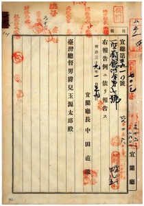 宜蘭廳訓令第七號支廳ニ於ケル地方稅手數料徵收事務取扱手續、宜蘭廳訓令第八號前訓令七號中改正、宜蘭廳訓令第九號三十三年訓令第八號諸營業開廢願屆取扱心得ニ等三項追加、宜蘭廳訓令第十號本年訓令第七號別紙樣式中削除ノ件、宜蘭廳訓令第十一號墓地火葬場及埋火葬取締規則施行細則取扱手續、宜蘭廳訓令第十二號貸座敷及娼妓取締規則施行手續、宜蘭廳訓令第十三號本年廳令第十五號ニ依リ船長ヨリ提出スヘキ發著屆書樣式及臨檢其他取扱方ノ件