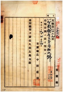 五二 第三九号 深坑庁及ヒ基隆庁両管内ニ豚虎列剌発生ニ付キ両庁ヨリ通知ノ件