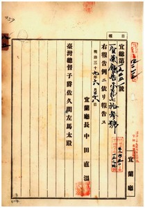 宜蘭廳告示第七十三號桃園廳獸疫發生、宜蘭廳告示第七十四號深坑廳豚疫流行地ノ停止事項解除及臺北外一廳獸疫發生通知、宜蘭廳告示第七十五號深坑外一廳獸疫發生ニ關スル通知、宜蘭廳告示第七十六號豚虎列剌發生、宜蘭廳告示第七十七號深坑外二廳獸疫發生通知、宜蘭廳告示第七十八號基隆廳豚疫流行地解除ノ件及三廳豚虎列剌發生通知、宜蘭廳告示第七十九號臺北外二廳獸疫發生通知、宜蘭廳告示第八十號臺北廳牛疫及豚虎列剌發生ノ件通知、宜蘭廳告示第八十一號桃園外一廳獸疫發生通知、宜蘭廳告示第八十二號三十八年告示第二十三號中壹圓未滿ヲ五圓未滿ト改ム、宜蘭廳告示第八十三號桃園廳豚虎列剌發生通知、宜蘭廳告示第八十四號地租其他納期ヲ定