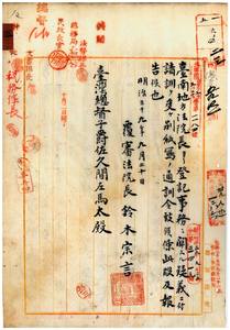 三 台南地方法院長ヨリ請訓アリタル登記事務取扱上ニ生シタル疑義請訓ニ対シ同法院長ヘ訓令シタル旨覆審法院長鈴木宗言ヨリ報告ノ件