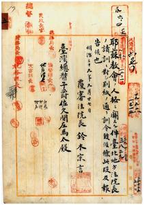 五 台北地方法院長ヨリ耶蘇教会ニ於テ業主権取得ノ場合ニ於ケル人格ニ関スル疑議請訓ニ対シ訓令シタル旨覆審法院長鈴木宗言ヨリ報告ノ件