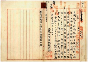 二三 日英通商航海条約及ヒ追加条約ノ規定ヲ日本帝国及英領加奈太間ノ修交通商及ヒ航海ニモ適用スヘキ条約ニ関シ大蔵次官若槻礼次郎ヨリ内牒ニ付キ淡水・安平両税関ヘ内牒ノ件