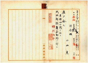 三五 台湾総督府民政部殖産局長代理横山壮次郎ノ内申ニ依リ小山克ヲ台湾総督府雇ヲ命シ民政部殖産局勤務ヲ命ス