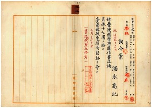 三二 台南郵便電信局長速水経憲ノ上申ニ依リ台南郵便電信局勤務通信助手満永高記ヲ台湾総督府通信書記補ニ任シ台南郵便電信局勤務ヲ命ス