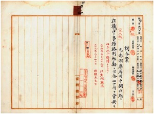 二五 澎湖庁長小林三郎ノ内申ニ依リ三月一二日付ニテ依願退官ノ元澎湖庁属田中鋼次郎ヘ在職中ノ殊ニ日露戦役中兵事事務及戒厳ニ関スル委員並ニ非常物資委員トシテ勤労尠ナカラサル為メ俸給予算残金ヲ以テ事務格別勉励ニ付キ一時金ヲ賞与ス
