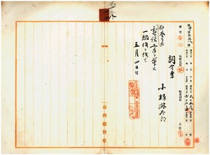 一二 台湾総督府民政部警務課長北原種忠ノ同署代理参事官大津麟平ヘノ内申書ニ基ク大津本署長代理ノ佐久間佐馬太総督ヘノ内申ニ依リ雇員小椋林太郎ニ警察専用電話工手ニヲ命シ民政部警察本署勤務ヲ命ス(履歴書未綴)