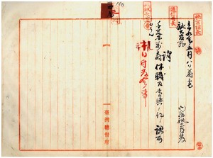 四九 台湾総督府民政部通信局長鹿子木小五郎ノ内申ニ依リ疾病療養中ノ台湾総督府海事官兼台湾総督府技師千葉万寿ニ文官分限令第十一条第一項第四号ニ依リ休職ヲ命シ事務格別勉励ニ依リ一時金ヲ賞与ス