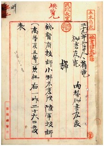 七三 台湾総督府技師小野木孝治ヲ陸軍技師ニ兼任ノ儀発令ニ付キ内務秘書官ヨリ通知ノ件