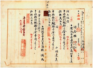 九 台北郵便電信局勤務台湾総督府通信書記藤村幸之進・台北郵便電信局勤務台湾総督府通信書記小坂史彦・台北郵便電信局勤務台湾総督府通信書記補牧綱丸ヨリ提出ノ疾病ニ罹リ職ニ堪ヘサル旨ヲ以テ辞職願ニ依リ藤村幸之進及ヒ牧綱丸ヲ昇級・昇給ノ上事務格別勉励ニ付キ一時金ヲ賞与シ本官ヲ免シ、小坂史彦ニハ事務格別勉励トシテ一時金ヲ賞与シ本官ヲ免ス