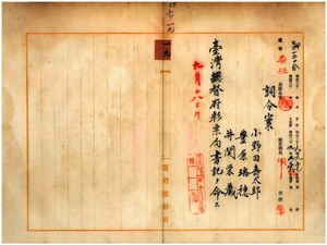 一九 台湾総督府彩票局長宮尾舜治ノ内申ニ依リ台湾総督府専売局書記ノ小野田寿太郎・豊原瑞穂・井関栄蔵ニ台湾総督府彩票局書記ヲ命ス