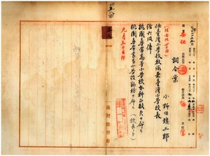 五八 桃園庁長津田毅一ノ内申ニ依リ嘱託小野田鎮三郎ヲ台湾小学校教諭兼校長ニ任シ桃園尋常高等小学校本科正教員ヲ命シ桃園尋常高等小学校勤務ヲ命ス