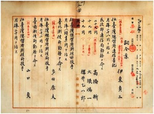 六二 台湾総督府民政部通信局長鹿子木小五郎ノ内申ニ依リ台湾総督府雇伊東貞三ヲ台湾総督府通信書記ニ任シ民政部通信局勤務ヲ命シ、同雇ノ高橋新・大隈鴻一・桜井乙八郎ヲ台湾総督府測候所技手ニ任シ台北測候所勤務ヲ命シ、同雇多田辰夫ヲ同技手ニ任シ台南測候所勤務ヲ命シ、同雇山口貞ヲ同技手ニ任シ恒春測候所勤務ヲ命シ、同雇ノ堀内仲左衛門・中橋六三郎ヲ台湾総督府灯台看守ニ任シ北島灯台勤務ヲ命シ、同雇山本順ヲ同灯台看守ニ任シ漁翁島灯台勤務ヲ命シ、同雇金子増之助ヲ同灯台看守ニ任シ打狗灯台勤務ヲ命ス