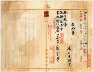 二二 台湾総督府民政部財務局税務課勤務台湾総督府属白尾俊員ハ疾病ニ罹リ職ニ堪ヘサル旨ヲ以テ辞職願ニ依リ事務格別勉励ニ付キ一時金ヲ賞与ス