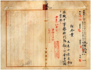三五 臨時台湾戸口調査部長後藤新平ノ内申ニ依リ元臨時台湾戸口調査部勤務台湾総督府雇小原末治ニ在職中事務格別勉励ニ付キ一時金ヲ賞与ス
