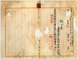 四九 台湾総督府民政部通信局長鹿子木小五郎ノ内申ニ依リ台湾総督府技師山本三次郎ニ台湾総督府通信書記補試験委員ヲ命ス(破損あり)