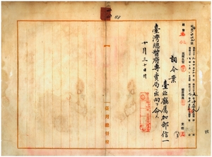 臺北廳屬加部信一ニ專賣局ヘ出向ヲ命スル件