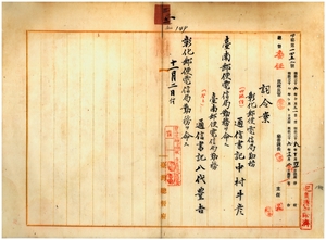 三五 彰化郵便電信局長杉本初吉ノ内申ニ依リ彰化郵便電信局勤務台湾総督府通信書記中村牛彦ニ台南郵便電信局勤務ヲ命シ、台南郵便電信局勤務台湾総督府通信書記八代豊吉ニ彰化郵便電信局勤務ヲ命ス
