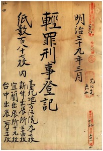 明治三十九年三月分輕罪刑事登記(臺北地方法院、新竹出張所、宜蘭出張所、台中出張所)