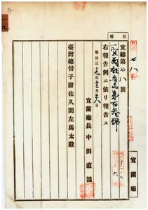 宜蘭廳告示第百三號深坑廳ヨリ豚虎列剌發生通知ノ件