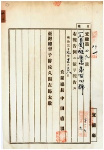 二〇 第一〇四号 台北庁・深坑庁両管内ニ豚虎列剌発生ニ付キ両庁ヨリ通知ノ件(明治四〇年民総第八一号)