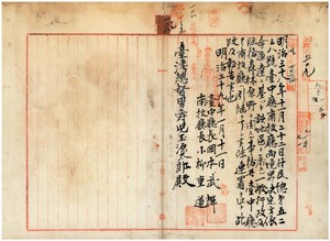 一二八 明治三八年一一月二二日付民総第五二三八号台中庁南投庁両境界決定方依命通達ニ基キ該地区ニ属スル一般行政及脳務森林原野ニ関スル事務ニ付キ台中庁ヨリ南投庁ヘ引継ヲ了シタルニ付キ報告ノ件(民総第五〇九号)