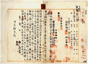 一六 明治三九年斗六庁訓令第二一号墓地火葬場及埋火葬取締規則取扱手続及ヒ明治三九年訓令第二三号市場取締規則取扱手続発布方ニ付キ斗六庁長荒賀直順ヘ照会ノ件