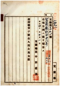 一八八 第八号 明治三五年一〇月宜蘭庁訓令第二八号警察職務規程施行細則改正ノ件