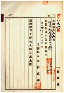 二四 第一二号 台北庁管内ニ豚虎列刺及ヒ疑似牛疫発生ニ付キ同庁ヨリ通知ノ件