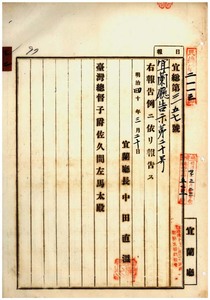 三二 第二〇号 台北庁管内ニ豚虎列刺発生及ヒ桃園庁管内ニ豚虎列刺及ヒ牛疫発生ニ付キ両庁ヨリ通知ノ件